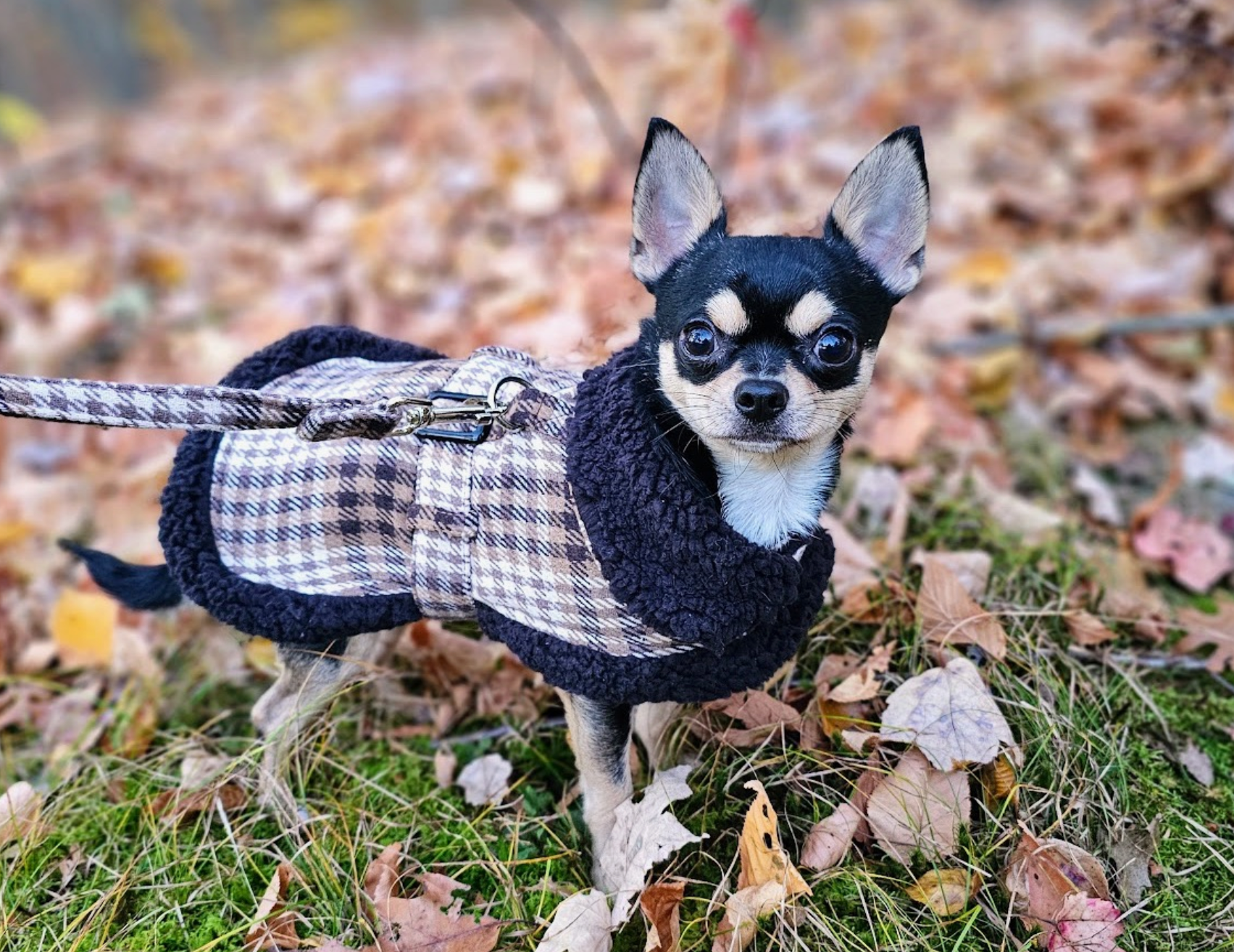 This plaid designer coat in brown and white features a thick, warm, and soft sherpa fleece collar and lining. This coat features a touch fastener neck and chest closures. It includes a matching leash and a D-ring for easy leash attachment.